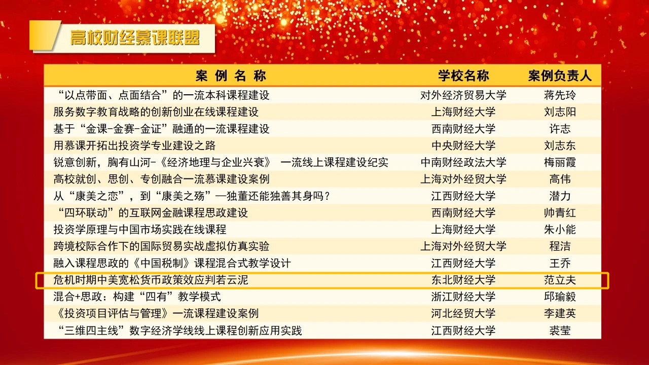 为贯彻落实教育部《关于加强高等学校在线开放课程建设应用与管理的意见》《关于一流本科课程建设的实施意见》精神,全面总结中国慕课十年成就,充分展示我国慕课建设与研究成果,挖掘更多典型应用,发挥表率、示范与引领作用,近日,在教育部高等学校教学信息化与教学方法创新指导委员会指导下,高校在线开放课程联盟联席会组织开展了“慕课十年典型案例”征集活动。经各联盟单位择优推荐、联席会专家遴选,认定了一批高水平、高质量的案例。我校范立夫团队的“危机时期中美宽松货币政策效应判若云泥”和杨兴凯团队的“爱尚生活,爱上电商——电子商务概论课程教学案例”2门课程教学案例,分别由高校财经慕课联盟和电子商务数字教育发展联盟推荐,成功获评“慕课十年典型案例”。